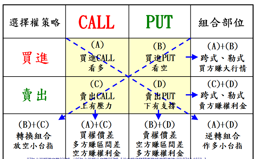 從選擇權的買方賣方 買權賣權,就可以衍生出各種不同的組合