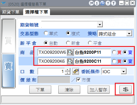 PS 注意事項 下組合單必須選擇IOC的條件,若是價差和沒有達到設定的價位會立即取消,若是選擇市價則馬上會成交,但是需要注意市價造成滑價的風險