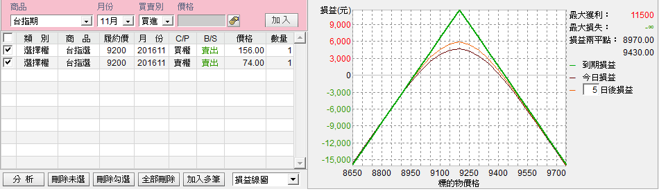 舉例說明: sell 9400 call看不漲,收取權利金46點,sell 9000put看不跌,收取權利金31點。放到結算日結算價落在9000~9400區間,就可以收取二邊權利金的加總;以買賣各1口計算,最大的獲利就是3850 ( (46點+31點)*每點50元 ),需要支付的保證金大約是 20000(組合後的最佳保證金) ;需要承擔的風險是無限大,如果行情大漲超過9400或是大跌超過9000 ,就會開始產生損失
