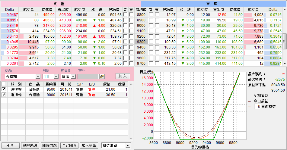 舉例說明: 買進9500call 和買進9000put 預期未來一個月內會大漲或大跌,漲跌超過履約價變成價內就會獲利,一邊大賺但是另外一邊會賠有限,若是到期仍是盤整落在9000~9500區間內 則權利金會全部歸零; 大賺+小賠 就是買方勒式(跨式)的策略